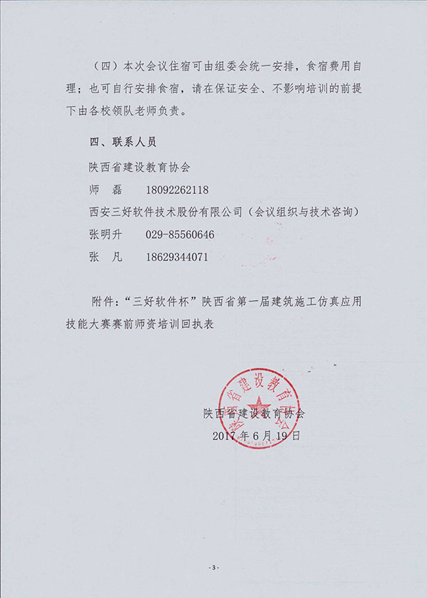 2017年6月19日,由陜西省建設(shè)教育協(xié)會發(fā)文《關(guān)于舉辦“三好軟件杯”陜西省第一屆建筑施工仿真應(yīng)用技能大賽賽前師資培訓(xùn)的通知》(陜建教協(xié)[2017]09號文件)正是對外公布!作為本次比賽的承辦方及技術(shù)支持單位,西安三好軟件技術(shù)股份有限公司將積極組織陜西省賽賽前師資培訓(xùn)相關(guān)工作。發(fā)文如下: