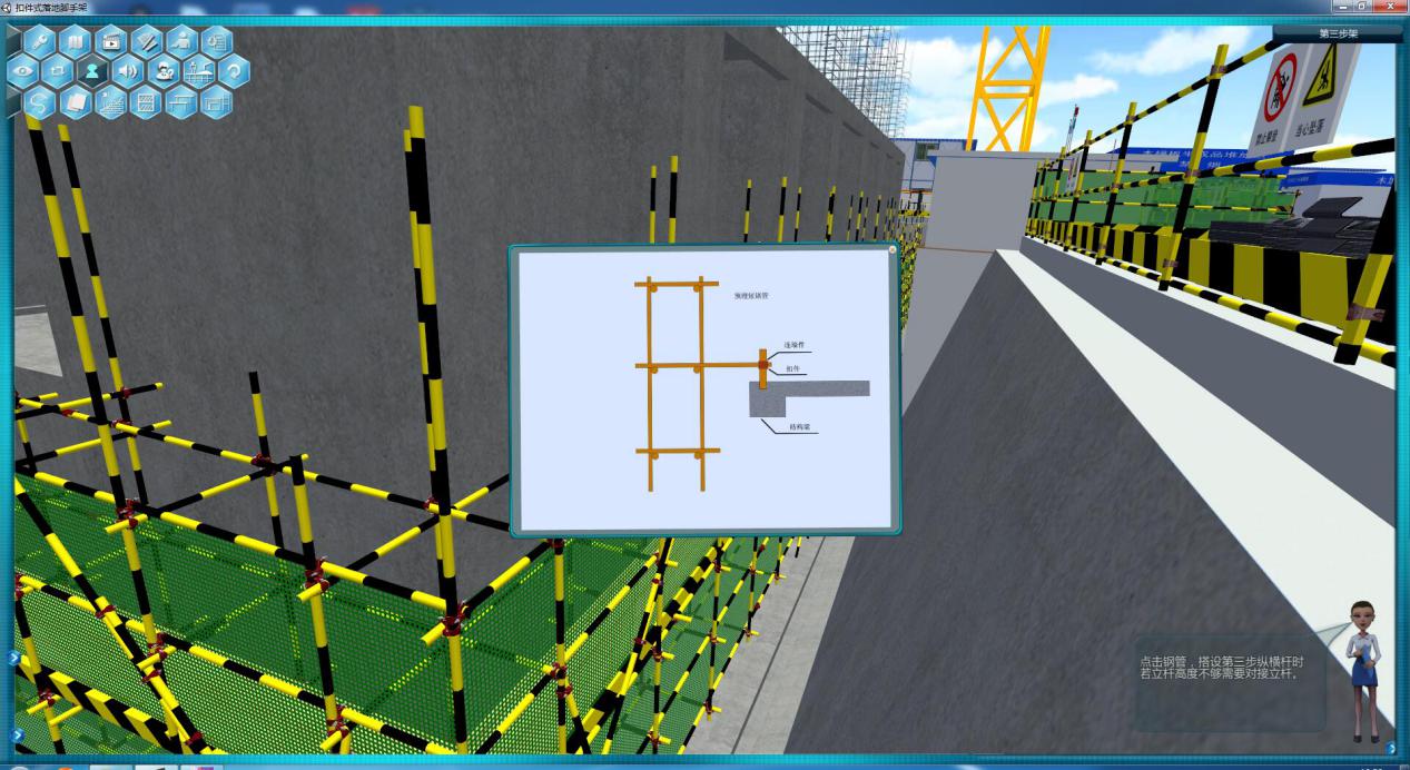 三好建筑輔助設(shè)施仿真實(shí)訓(xùn)平臺(tái)通過對(duì)腳手架的搭建工藝流程、卸料平臺(tái)、施工電梯和塔吊的搭設(shè)流程等進(jìn)行重點(diǎn)展示,還原施工過程中的質(zhì)量檢測(cè)及驗(yàn)收,保證每個(gè)階段的施工安全,從而加深學(xué)生對(duì)輔助設(shè)施應(yīng)用和使用方法的了解。