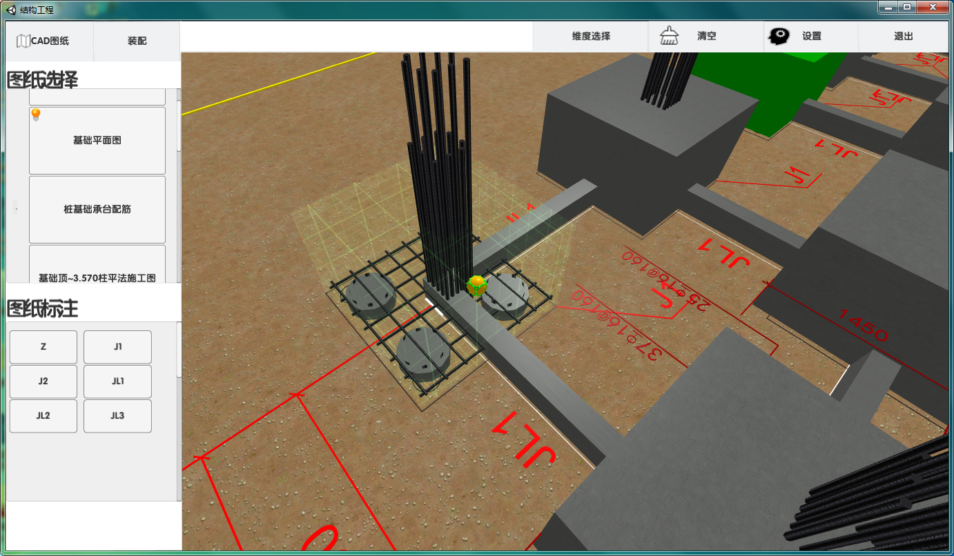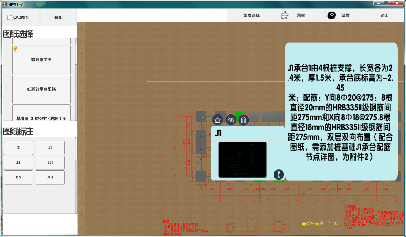 點擊CAD圖紙上的任意部位,通過映射關(guān)系實現(xiàn)二維到三維的對應(yīng)轉(zhuǎn)換。在三維模型中以不同顏色顯示不同構(gòu)件,通過移動鼠標(biāo)即可瀏覽光標(biāo)對應(yīng)的構(gòu)件信息和節(jié)點詳圖,同類構(gòu)件歸類學(xué)習(xí)。